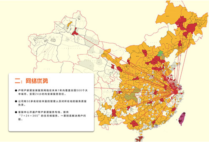 截至目前,"天猫&户帮户"已在全国一、二、三线城市发展了200余家区域服务中心,覆盖上海、南京、天津、杭州、郑州、合肥、长沙、济南、青岛、南昌、西安、太原、兰州、苏州、无锡、广州、大庆、哈尔滨、温州、邯郸、淄博、乌鲁木齐等各大城市,将为全国3亿家庭提供标准化、全透明、一口价的家装电商服务。